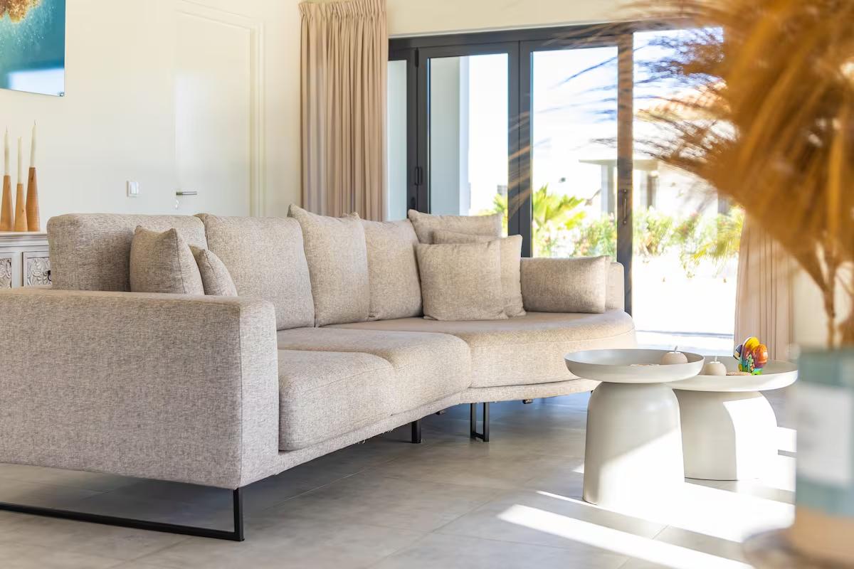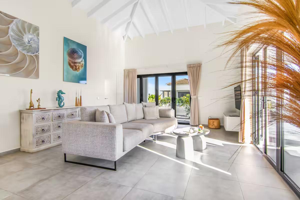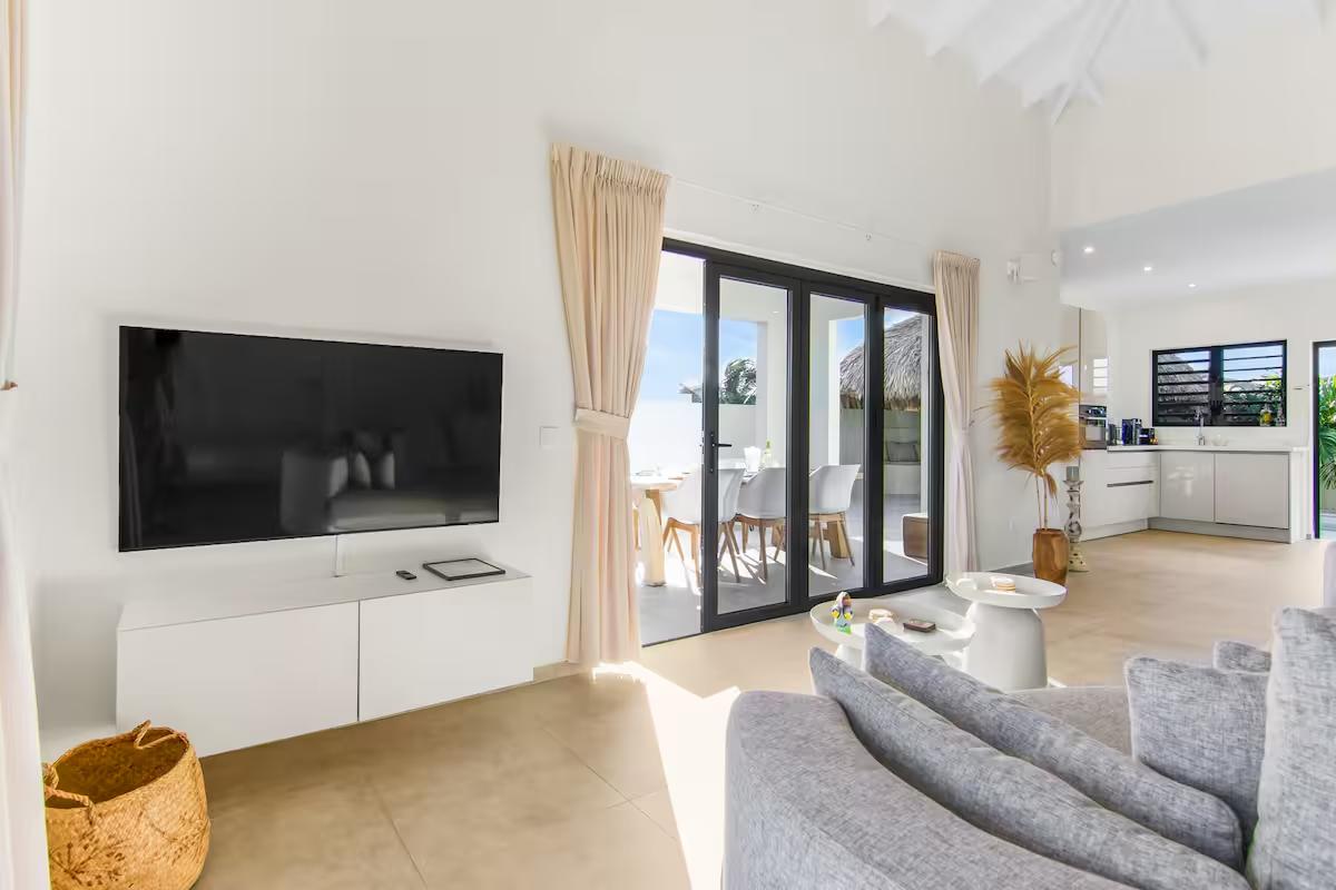 De lichte, open woonkamer is de perfecte plek om te ontspannen. Met een comfortabele zithoek, airconditioning en openslaande deuren naar de veranda leef je hier net zo makkelijk binnen als buiten. Geniet van een goed boek, een spelletje of je favoriete serie op de smart-tv – alles is aanwezig.