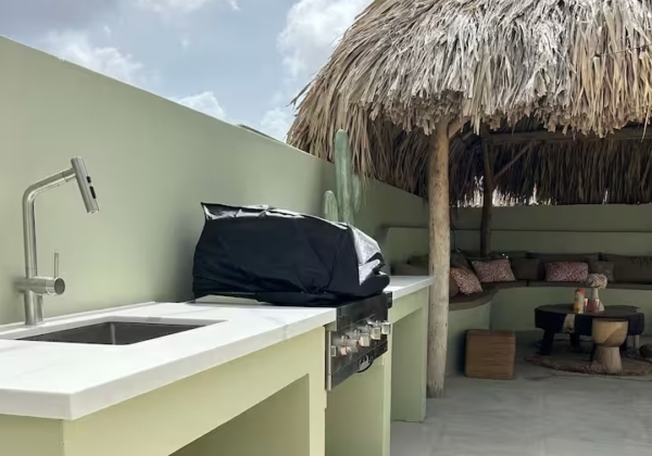 De tuin is jouw privé tropische oase. Start de dag met een duik in het zwembad, lees een boek in de schaduw van de veranda of koel af onder de buitendouche. In de ruime luxe buitenkeuken* met stromend water bereid je een ontbijt, lunch of diner in de open lucht. Dankzij de omheining en palmen geniet je van optimale privacy – van ’s ochtends vroeg tot zwoele avonden onder de sterren.